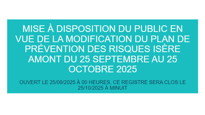 La Préfète de l'isère informe qu'il sera procédé à une mise à disposition du public au sujet du projet de modification de plan de prévention des risques inondation Isère Amont en vue de son approbation, du 25 septembre au 25 octobre 2025, en application de l'arrêté préfectoral n°38-2024-12-05-00005 du 5 décembre 2024.